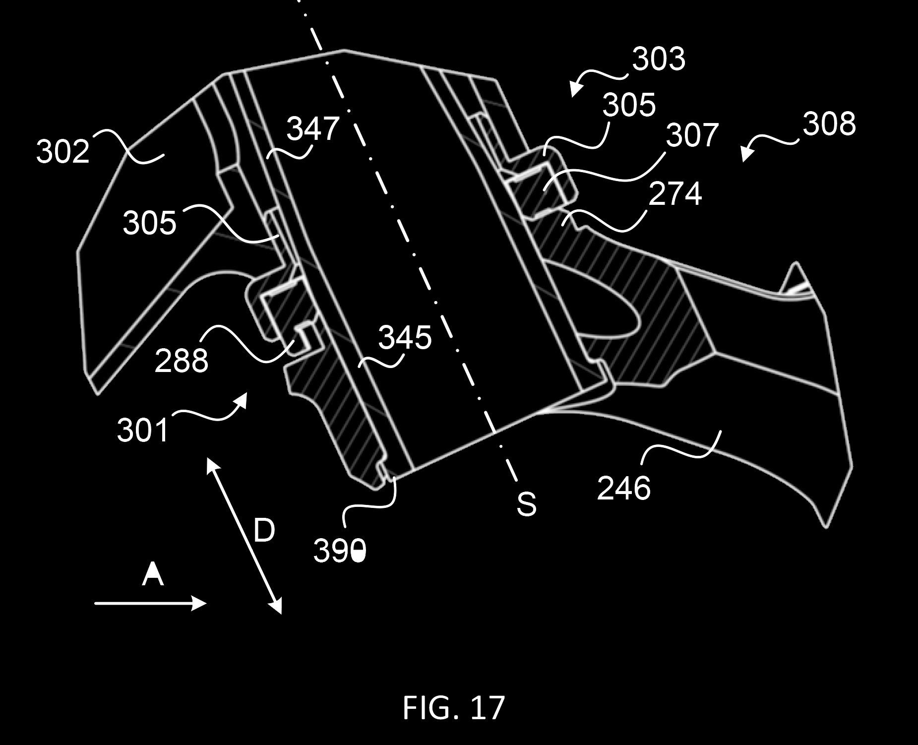 „Telo graničnika 272 može biti zaseban, uklonjiv element u odnosu na krunu 246. Telo graničnika 272 takođe može biti oblikovano zajedno sa krunom 246 ili trajno, odnosno polutrajno, pričvršćeno za krunu 246, na primer pomoću lepka, zavarivanja, lemljenja ili sličnih postupaka“.
