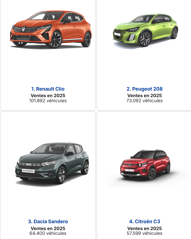 Da ne dužimo previše već da što pre kažemo da je Renault Clio ostao najprodavaniji novi automobil, sa više od 101 otpremljenih jedinica, daleko ispred direktnog konkurenta Peugeota 208, koji se takođe prodaje u 100% električnoj verziji (svaki peti isporučeni je električni, što je 2025. godine bio prosek prodaje električnih automobila na francuskom tržištu).