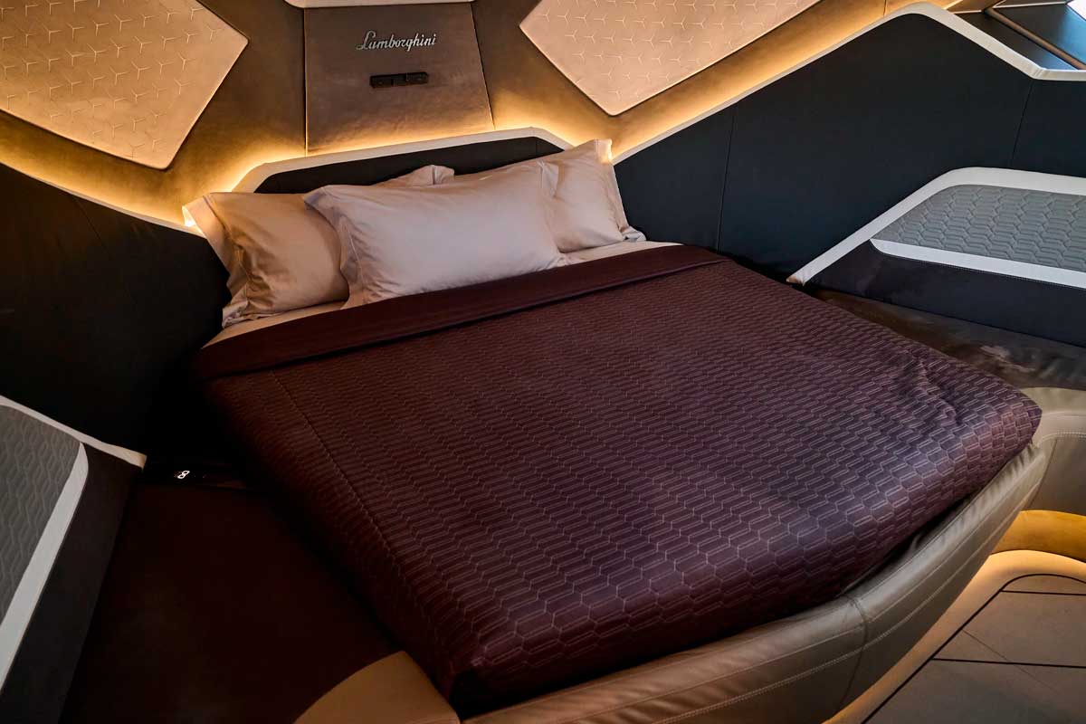 Jahta je opremljena vrhunskom opremom kakva se retko viđa na plovilima ove veličine: uvlačivi 43-inčni televizor, Crestonov audio-sistem posebno razvijen za Lamborghini, napredna navigacija sa dodirnim mapama, kao i glavna kabina sa panoramskim krovom u obliku Lamborghinijevog logotipa.