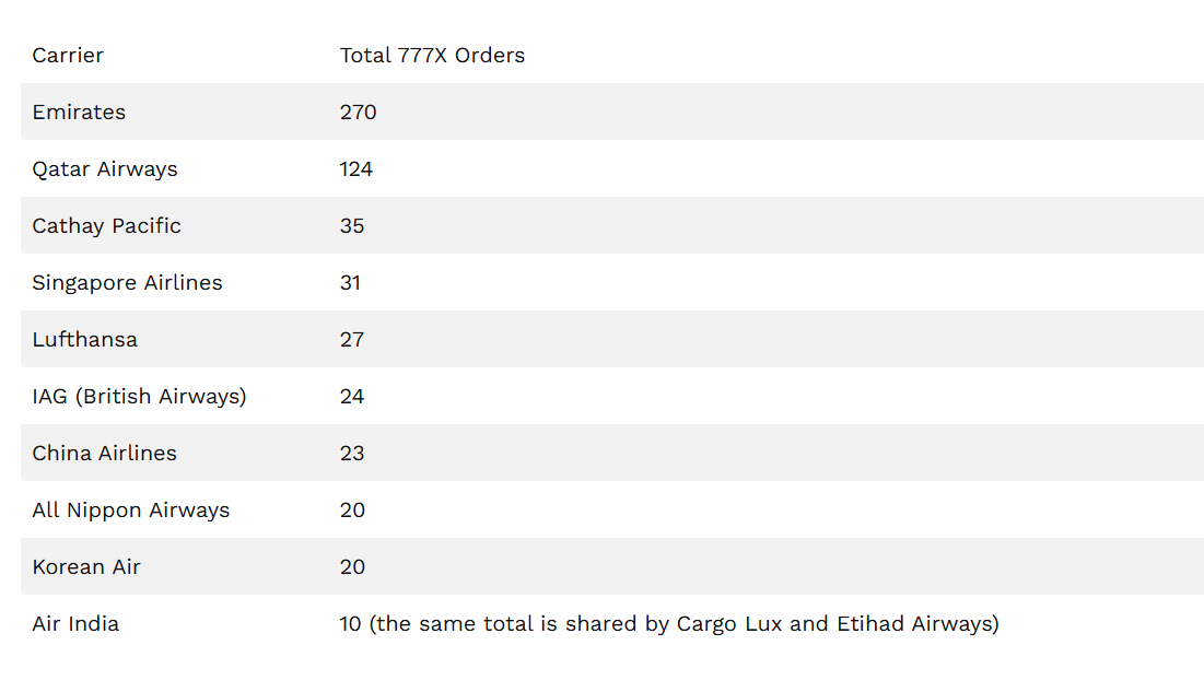 Kada sertifikacija bude završena, tempo isporuka biće tri do pet aviona mesečno. Trenutno postoji ukupno 619 narudžbina: 35 modela 777-8, 521 model 777-9 i 63 teretna 777-8F.