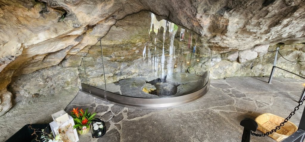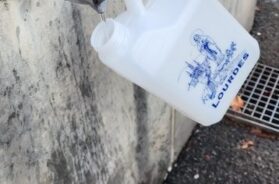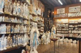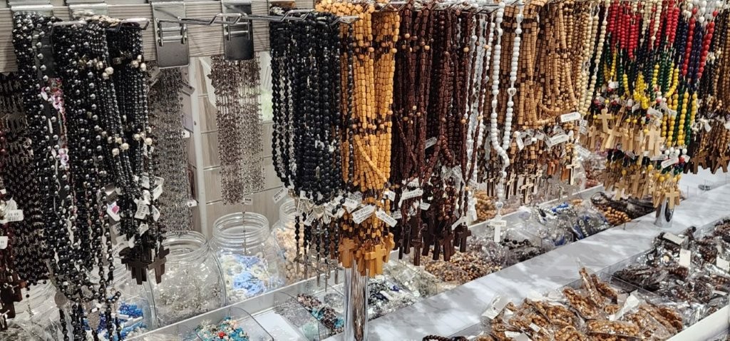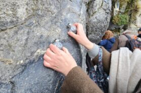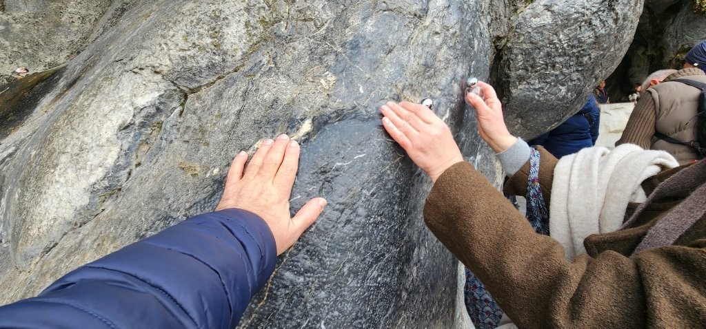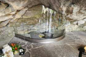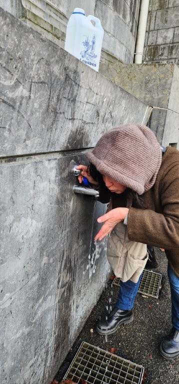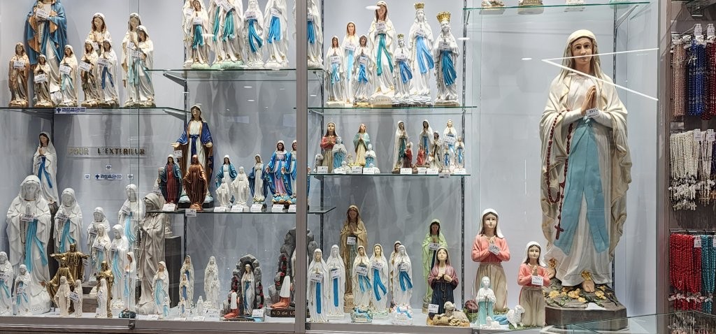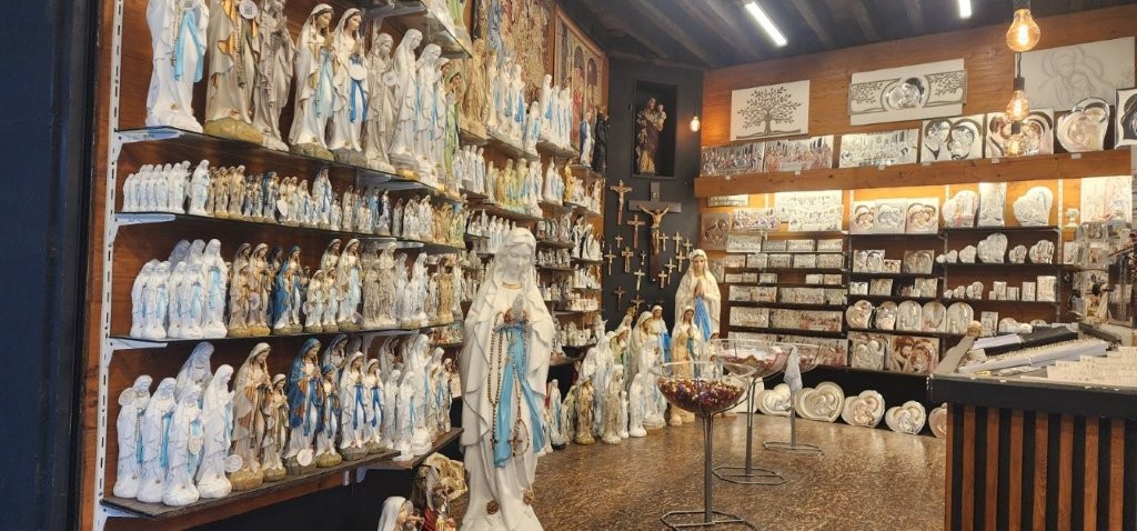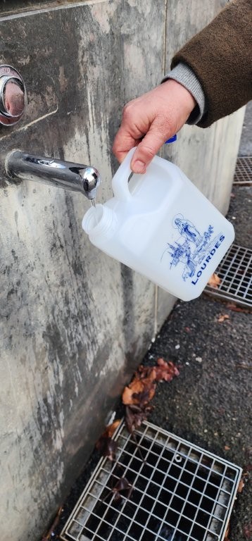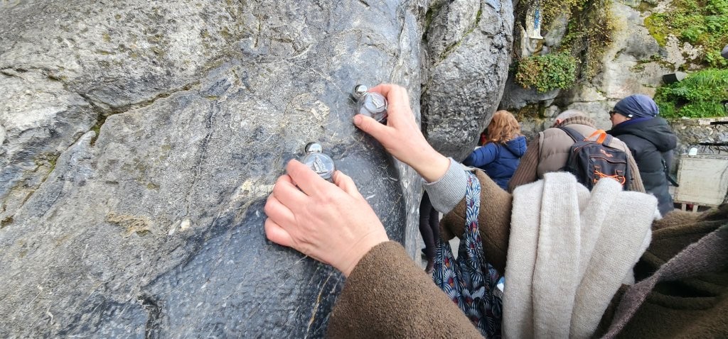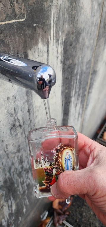 Za one koji nisu poneli adekvatne posude, u samom gradu, koji je pretvoren u ogroman religiozni šoping centar, mogu se kupite flašice svih dimenzija i oblika. Nakon što se napune „svetom“ vodom, poželjno je ući u pećinu i rukom ili flašicom trljati njene zidove, za šta je ponekad neophodno čekati više sati u nepreglednom redu! Pojedini piju vodu ili se peru njome iako je ledena u sred zime, odnosno izlažu bolesne delove tela. Mi donesosmo kući nekoliko kanistera od po pet litara, u šali rekoj mojoj „starki pravoslavki“ (supruzi u prevodu) da napuni kadu, ko zna možda će se podmladiti i prolepšati :-).